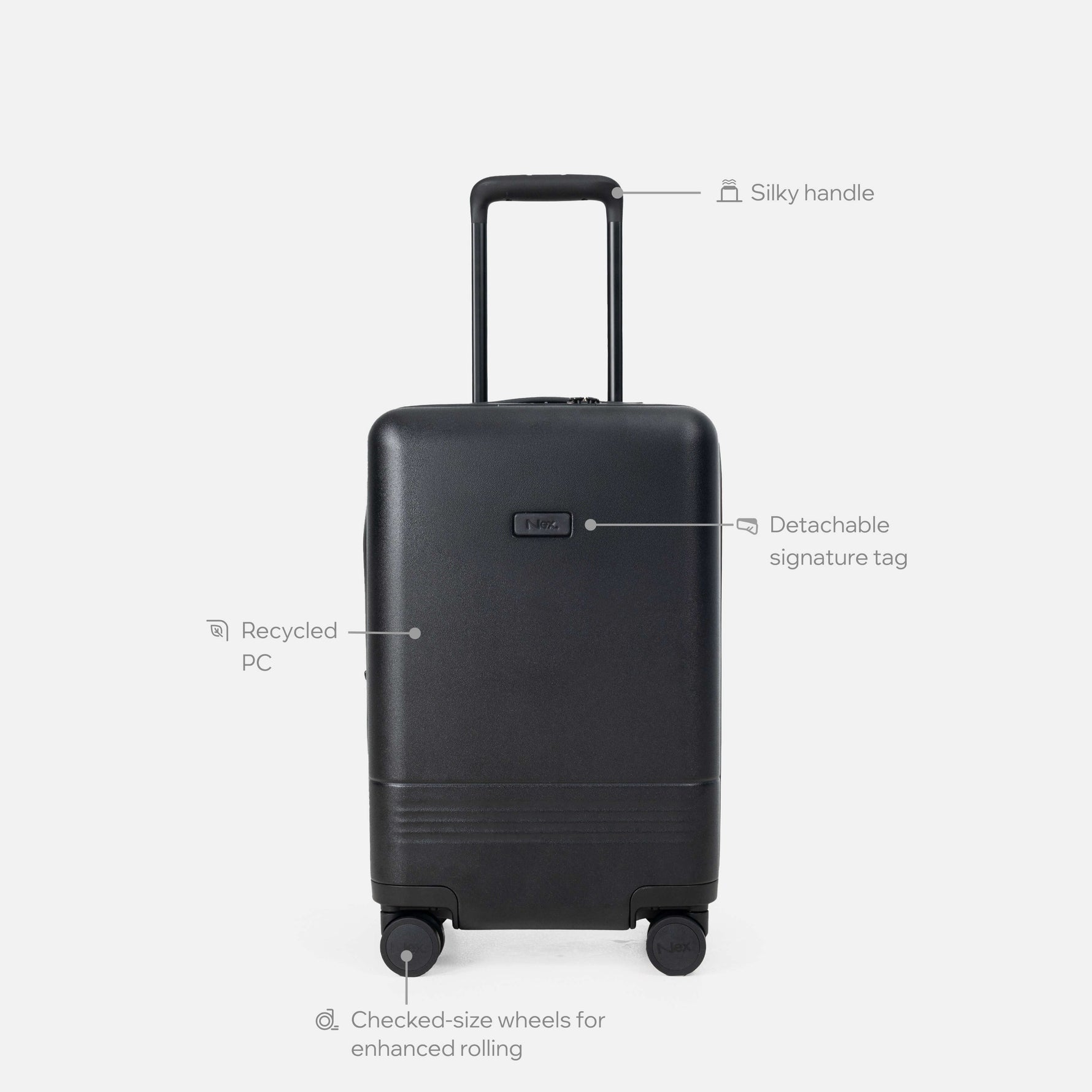 Personalized Details: On the front, a removable Signature Tag made of vegan leather is attached via Velcro. It comes standard with the Nex logo, but you can swap in a custom monogram tag with your initials or a meaningful symbol to truly make it your own. Personalization is more than a nicety – it’s the new baseline expectation for luxury travelers today, and this luggage delivers that bespoke touch.
